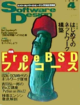 Software Design 誌 1997 年 4 月号の "FreeBSD フルコース" 特集 (技術評論社発行) です。 インストールから -current の追いかけ方までのすべてをカバーした FreeBSD の記事が 80 ページにわたって掲載されています。 |