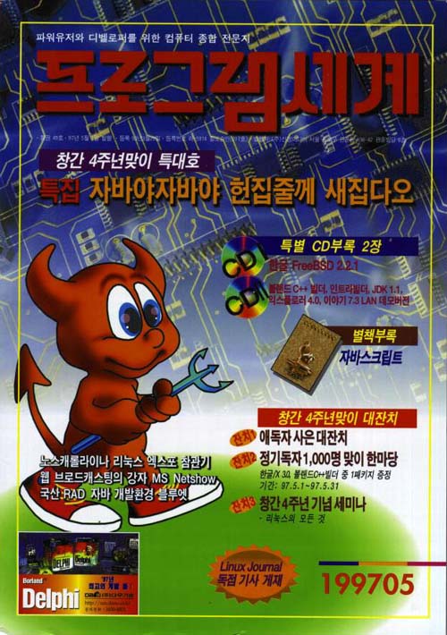 韓国の UNIX 雑誌 1997 年 5 月号の表紙です。 付録 CD にFreeBSD 2.2.1が収録されています。 |