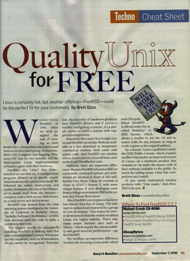 Sm@rt Reseller Online の 1998 年 9 月号に掲載された Brett Glass の Quality Unix for FREE です。 |