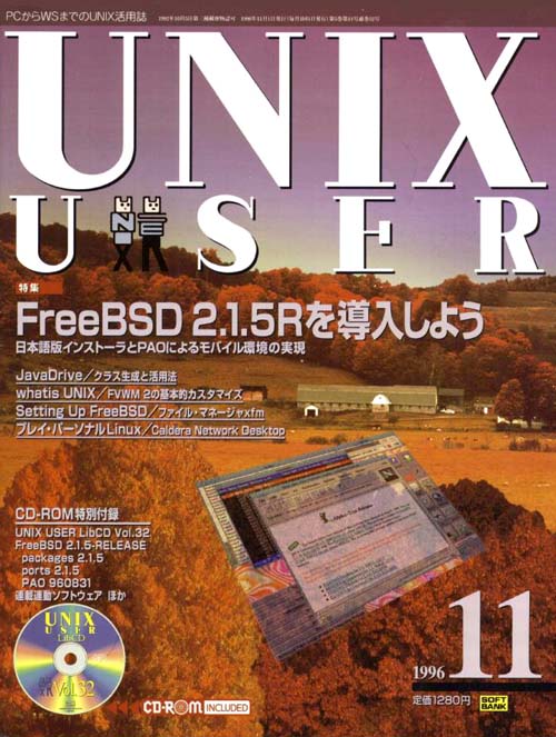 UNIX User 誌 1996 年 11 月号です。 付録 CD に FreeBSD 2.1.5 が収録されています。 |